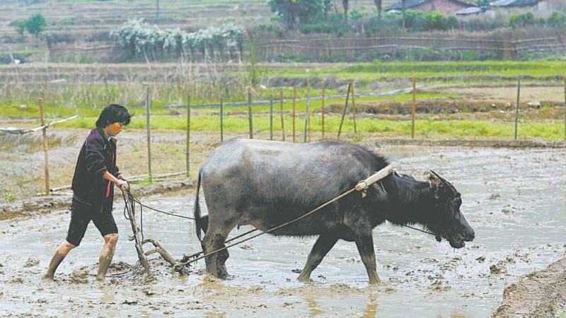 从阳山县城西行,蜿蜒20公里,停下,深呼吸,淡淡青草香,混着翻耕后的新鲜泥土味,在鼻息间融合、发酵。 南国四月,正是温润时节。山脚小盆地中,几户村民挽起裤脚,露出结实的小腿,赶牛下田。 几声悠长的吆喝声,透出山野人处江湖之远的自在闲适。